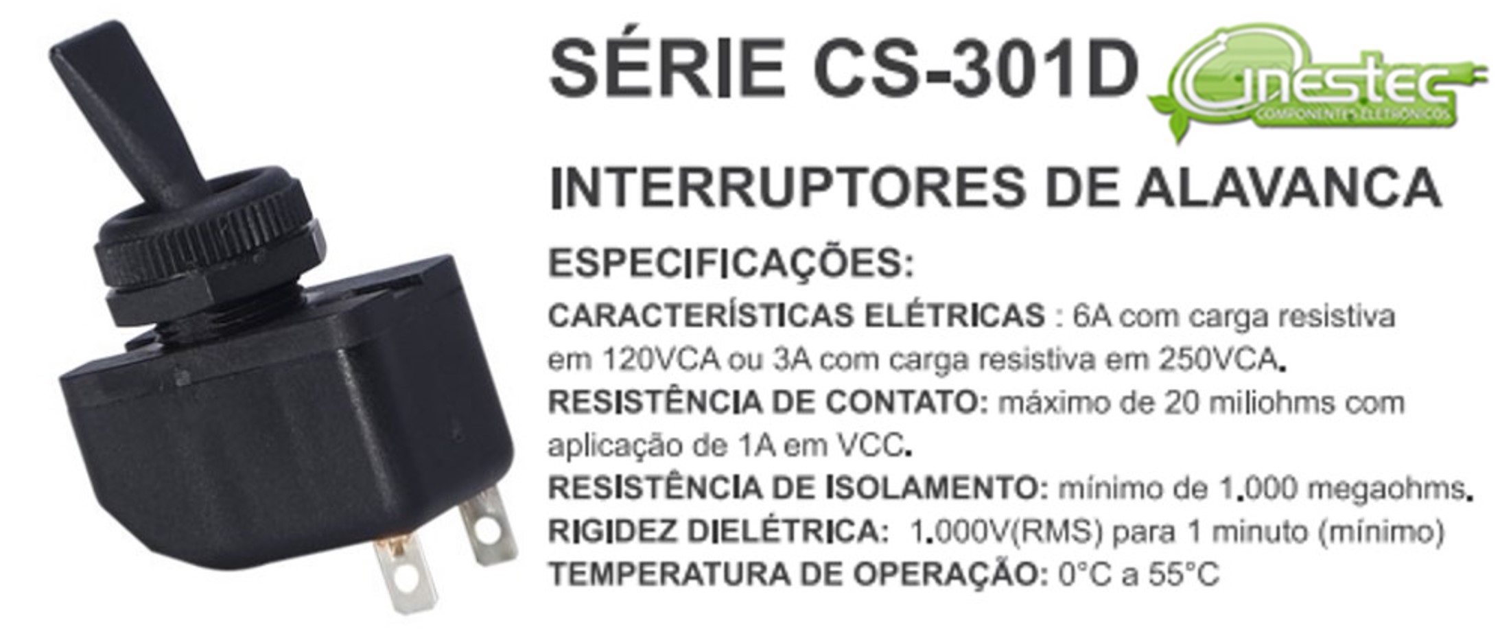 - Caracteristicas eletricas: 6A com carga resistiva em 120V ou 3A com carga resistiva em 250V, (CS-301D),