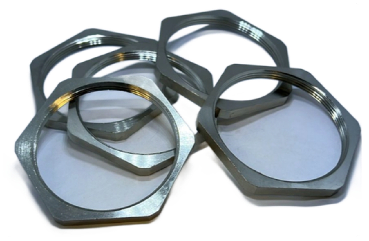 PACOTE COM 5PÇS DE CONTRA PORCAS DE LATÃO NIQUELADO TAMNHO M63 x 1,5