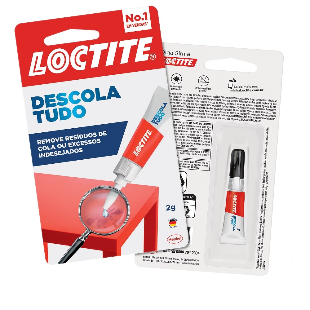 Loctite Descola Tudo 2g, remove vários tipos de colas, fitas, etiquetas, até mesmo Loctite Super Bonder e dedos colados. Fórmula em gel, não escorre.