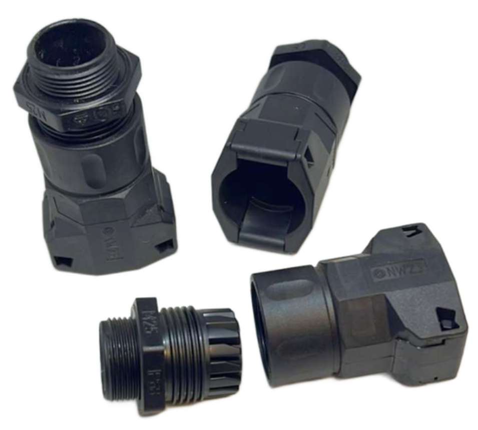 A terminacao reta com prensa cabo e engate rapido existe para facilitar a conexao e consequente reducao do tempo de montagem.