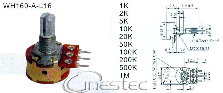 POTENCIOMETRO ROTATIVO 10KB 3 TERMINAL 16MM L15/CI COM CHAVE WH160-A