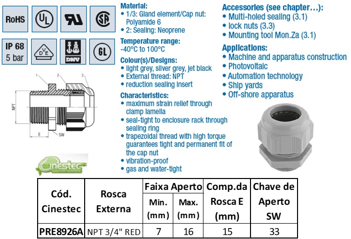 PRENSA CABO COM CONTRA PORCA S-TEC PA6 PRETO EXE NPT 3/4