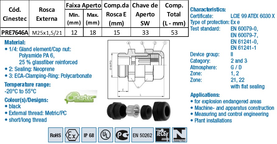 PRENSA CABO S-TEC ATEX PA6 M25 X 1,5 - ROSCA LONGA - INSERTO JAT