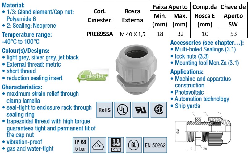 PRENSA CABO -TEC EM PA 6 M40 - ROSCA CURTA COM VEDACAO CINZA
