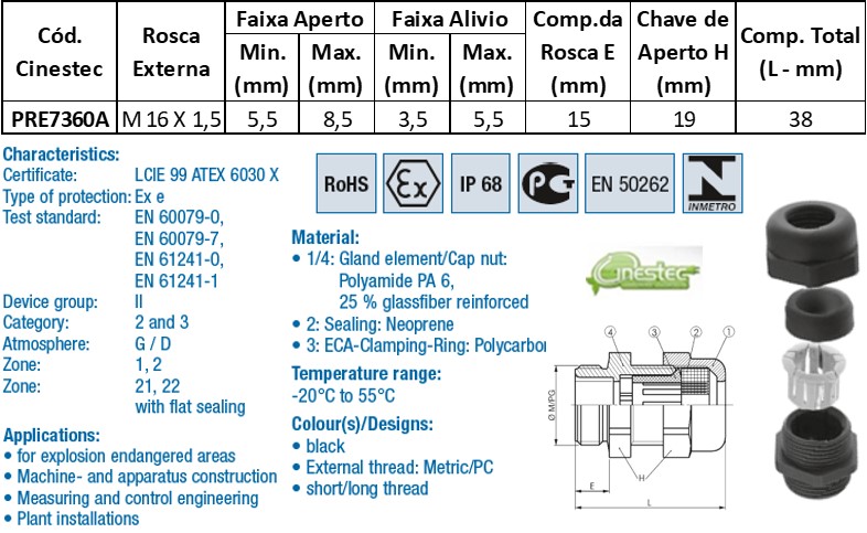 PRENSA CABO WADE-TEC EXE ATEX PA6 M16 X 1,5 - ROSCA LONGA