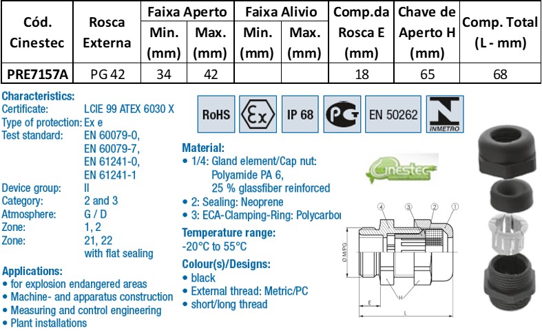 PRENSA CABO WADE-TEC EXE ATEX PA6 PG 42 - ROSCA LONGA