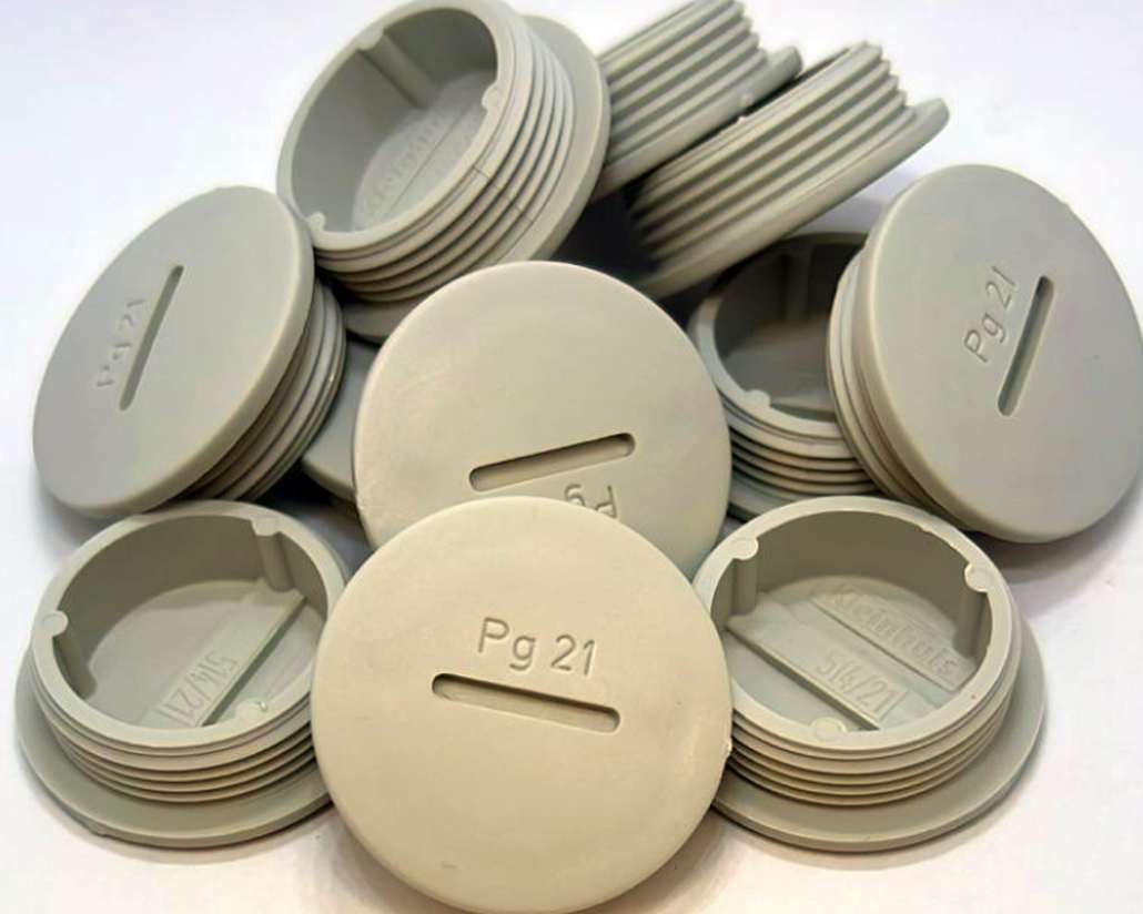 Caixa com 20 peças do tampão redondo com fenda em poliamida (nylon) PA6 para furo/rosca tamanho PG21.